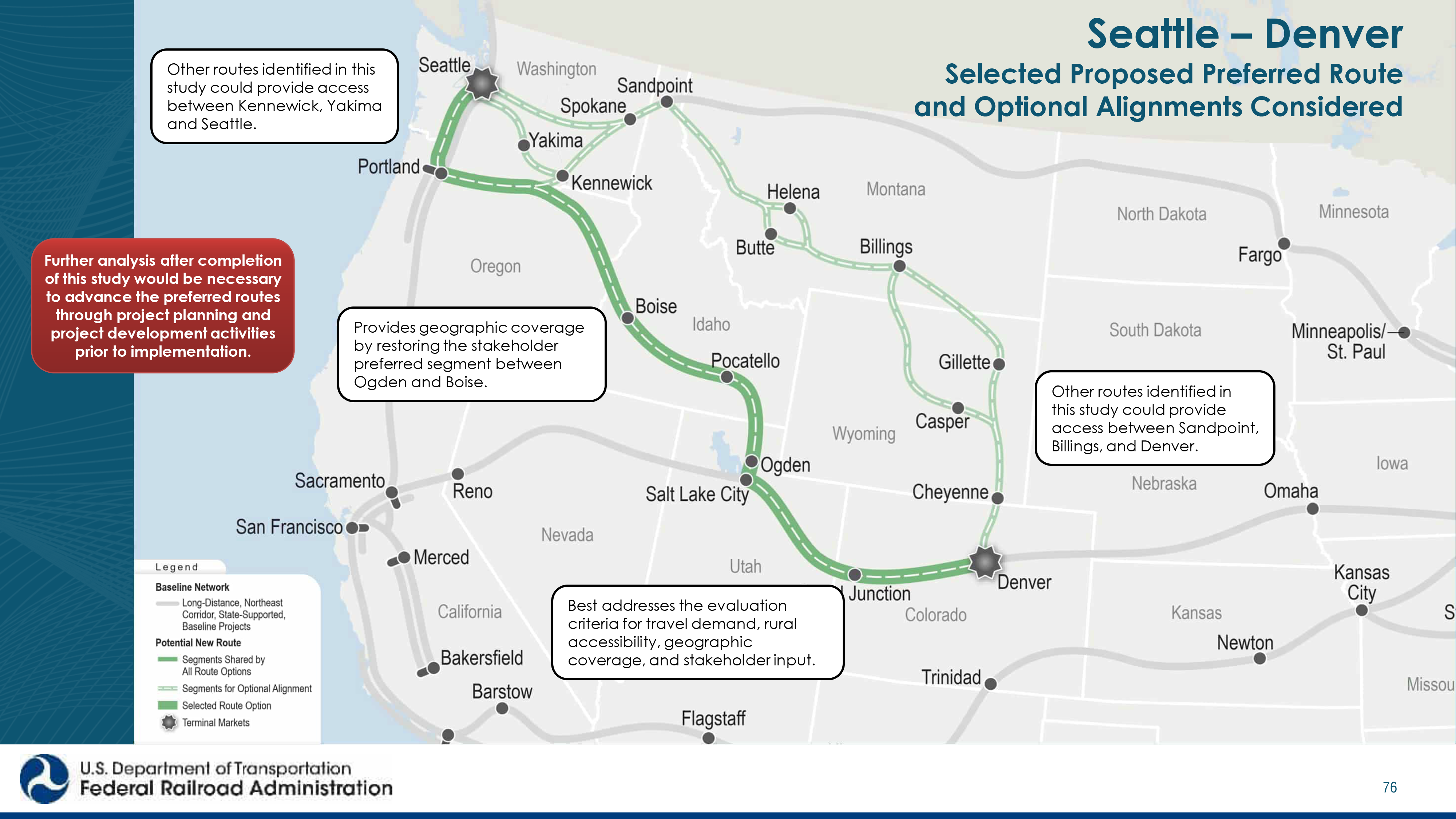 We are moving towards restoring a true national rail network that includes service to the much of the Greater Northwest. The Federal Railroad Administration's Long-Distance Service Study is recommending 15 routes to expand the nation's passenger rail system. Selected by the Long-Distance Service Study is the former Pioneer corridor, connecting Seattle, Portland, Boise, Salt Lake City, and Denver as recently as 1997.